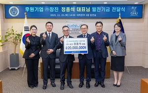 민주신문=조경환 기자|경상국립대학교(GNU·총장 권진회)는 기계설비 및 가스시설 공사업을 운영하는 ㈜창진 정종석 대표가 대학발전기금 500만 원을 기부했다고 밝혔다. 정종석 대표는 지난해 12월 1000만 원을 기부한 데 이어, 앞으로 4년간 매년 500만 원씩 모두 2000만 원을 기부하기로 약정하며 대학과의 인연을 지속적으로 이어가고 있다.발전기금 전달식은 11월 25일 오후 2시 대학본부 3층 접견실에서 경상국립대학교 권진회 총장, 오재신 국제처장과 ㈜창진 정종석 대표, 정욱태 부장, 김낭원 대리 등 관계자들이 참석한 가운데