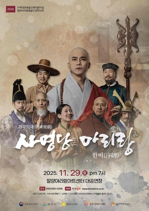 민주신문=조경환 기자|경남 밀양시(시장 안병구)는 오는 28일 오후 2시와 29일 오후 7시 밀양아리랑아트센터 대공연장에서 밀양아리랑예술단(단장 김금희)의 2025년 창작 신작 뮤지컬 '사명당 아리랑, 한비(汗碑)'를 선보인다.이번 작품은 문화체육관광부 지역대표예술단체 지원사업으로 제작됐다. 밀양아리랑예술단과 밀양시문화도시센터(장병수 센터장)가 협력해 지역예술인, 청년예술인, 밀양아리랑영재단, 시민배우 등 60여 명이 수개월간 준비한 공연이다. 지난 20일에는 밀양 용궁사(주지 정무스님)에서 사명대사 역 이계훈 배우와 보우대사 역