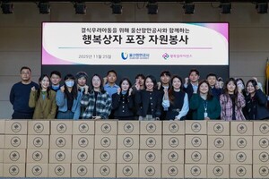 민주신문=이예림 기자|울산항만공사(UPA, 사장 변재영)는 공사 2층 다목적홀에서 지역 취약계층 아동을 돕기 위해 '2025 행복얼라이언스 행복상자 프로젝트'에 동참했다고 25일 밝혔다.봉사에 참여한 울산항만공사 임직원들은 물품 및 상자포장, 응원 편지 작성 등의 자원봉사를 펼치며 연말을 맞아 따듯한 온기를 전했다.울산항만공사 변재영 사장은 "울산항이 울산의 관문 역할을 하듯, 울산항만공사가 지역 공동체에 따뜻함을 전하는 통로가 되길 바란다"라며 "앞으로 사회적 약자를 위한 지속적인 나눔과 참여형 사회공헌 활동을 확대해 나가겠다"고