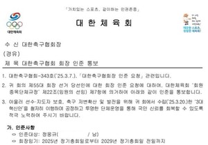 민주신문=최경서 기자|정몽규 대한축구협회장이 대한체육회로부터 취임 인준을 받았다. 당선된 지 한 달여 만이다. 이로써 오는 2029년까지 협회를 이끌게 됐다.정 회장은 28일 자신의 사회관계망서비스(SNS)를 통해 "제55대 대한축구협회장 선거에서 당선된 이후 한 달여 만에 대한체육회로부터 인준을 받았다"며 "유승민 대한체육회장께 감사드린다"고 말했다.그는 "새로운 이사회를 구성해 대한축구협회 운영을 조속히 정상화하겠다"며 "각종 위원회를 통해 공석인 23세 이하(U-23) 대표팀 등 남녀 연령별 대표팀 감독을 빠르게 선임하고, 각