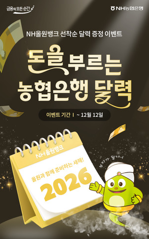 민주신문=김혜인 기자|NH농협은행은 연말을 맞아 고객 성원에 보답하기 위해 내달 12일까지 2026년 농협은행 달력 증정 이벤트를 진행한다고 25일 밝혔다.이번 이벤트는 NH올원뱅크 이벤트 페이지에서 세 가지 디자인 중 원하는 달력을 선택해 신청하면 된다. 총 2만5000명에게 선착순으로 증정되고 신청한 달력은 고객이 입력한 주소로 무료 배송된다.농협은행 관계자는 "새해의 풍요와 행운을 기원하는 마음을 담아 이번 이벤트를 준비했다"며 "NH올원뱅크의 다양한 금융 서비스와 함께 뜻깊은 2026년을 맞이하길 바란다"고 말했다.