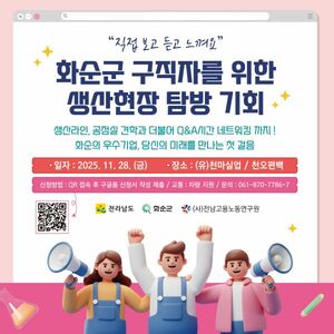 민주신문=조일상 기자|전라남도 화순군(군수 구복규)은 오는 11월 28일 지역 구직자들에게 실제 산업현장을 직접 보고 체험할 수 있는 '기업 탐방 프로그램'을 운영한다고 25일 밝혔다.이번 프로그램은 관내 기업인 (유)천마실업을 방문해 생산라인과 주요 공정시설을 견학하고, 기업 관계자와의 Q&A, 직무 안내, 현장 네트워킹 등을 통해 구직자들이 실질적인 취업 정보를 얻을 수 있도록 구성됐다.이번 탐방으로 구직자들이 실제 작업 환경을 경험함으로써 직무 선택의 폭을 넓히고, 취업 방향을 구체화하는 데 도움이 될 것으로 기대되며, 기업도