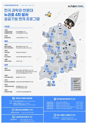 민주신문=이예림 기자|전북특별자치도 무주군 설천면 반디랜드 내 반디별천문과학관이 오는 26일과 27일 양일간 우주항공청의 '누리호 4차 발사 성공'을 기원하는 과학행사를 개최한다고 25일 밝혔다.이날 행사는 오후 1시부터 밤 9시까지 우주항공청의 협조를 받아 진행될 예정으로, 참가자들은 천문과학관에서 진행하는 계절 별자리 강의와 천제 관측(토성) 행사에 함께하게 된다.박제훈 천문대장은 "누리호 4차 발사는 과학적·산업적 성과를 동시에 겨냥한 중요 사업이며, 무엇보다 민간 주도로 한국의 독자적 우주 수송 능력을 보여준다는 점에서 기대