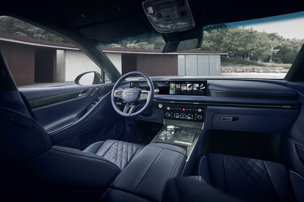 G80 전동화 모델의 실내는 늘어난 축간거리와 수평적 디자인을 강조한 설계로 여유로운 공간감을 주는 동시에 고급스럽고 하이테크한 감성이 더해져 고차원의 럭셔리 경험을 선사하는 공간으로 진화했다.